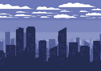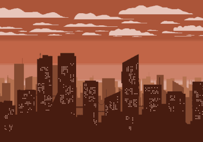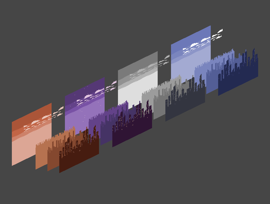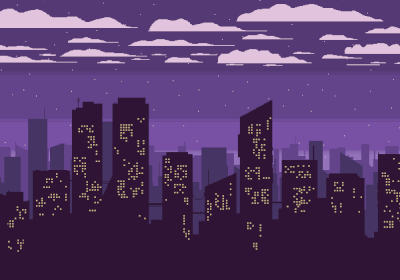 4 variations of original artwork - 960x540 px, horizontally tileable pixel art cityscape backgrounds. Each with 5 layers: